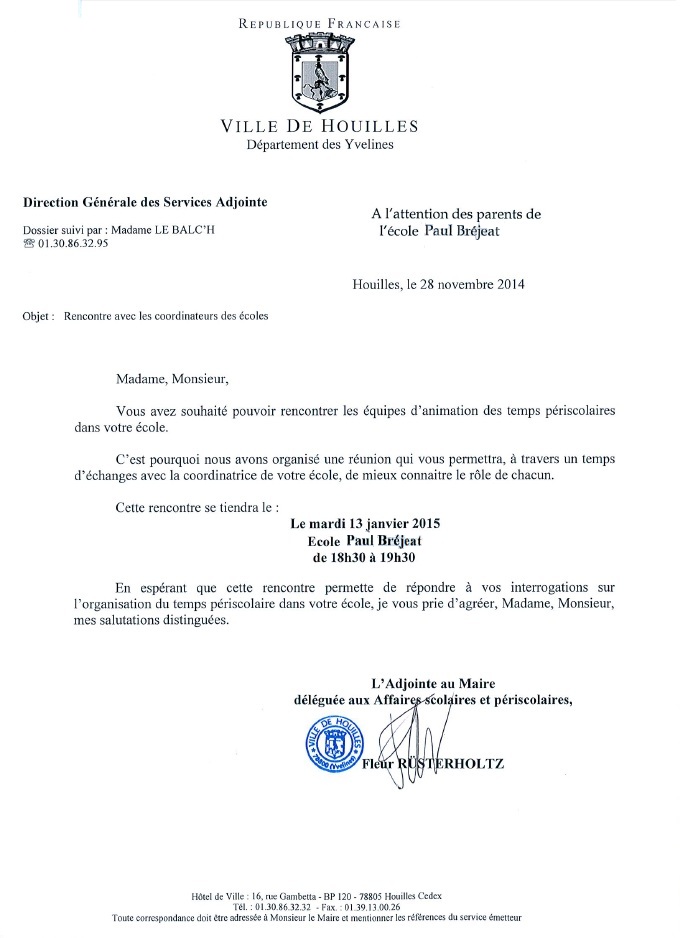 Ecole Bréjeat : La réunion périscolaire aura lieu le 13 janvier 2015 fcpe houilles / 4 décembre 2014 Cette réunion est ouverte à l’ensemble des parents. N’hésitez pas à venir rencontrer l’équipe d’animation des temps périscolaires de votre école ! Pour plus d’information, consultez le courrier de la mairie ci-dessous : Partager : Partager sur Facebook(ouvre dans une nouvelle fenêtre) Facebook Partager sur X(ouvre dans une nouvelle fenêtre) X Plus Imprimer(ouvre dans une nouvelle fenêtre) Imprimer Email a link to a friend(ouvre dans une nouvelle fenêtre) E-mail J’aime chargement…