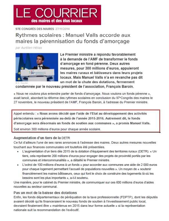 Lors du Congrès des Maires, le 27 novembre 2014, le Premier ministre, Manuel Valls, a répondu favorablement à la demande de l’Association des Maires de France de transformer le fonds d’amorçage d’aide de l’Etat au développement des activités périscolaires, en fond pérenne.