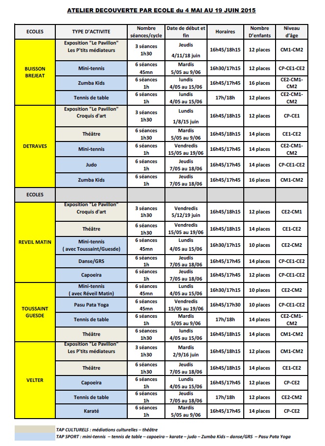 Téléchargez le Programme des Ateliers découverte du 4 mai au 19 juin 2015 ou retrouvez le sur le site de la ville dans l’Espace Famille.