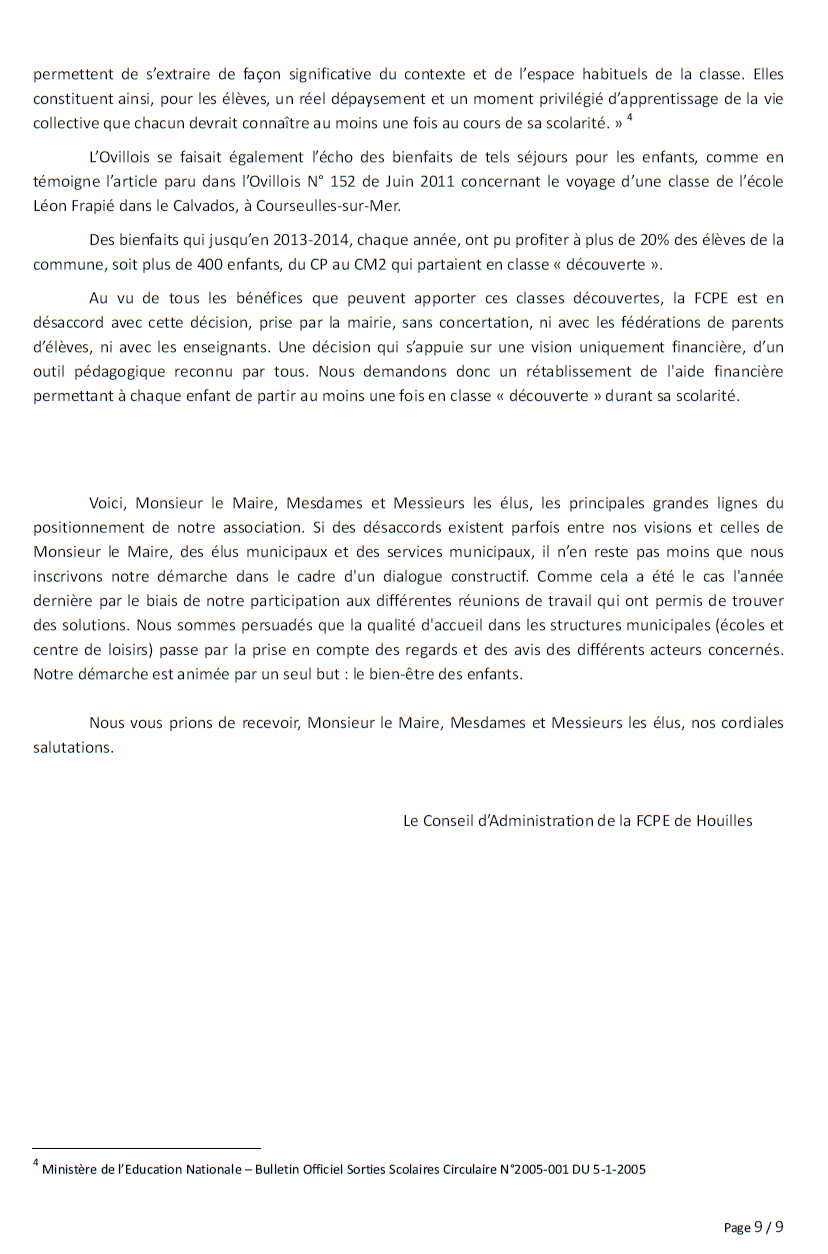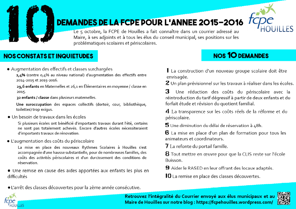 Le lundi 05 octobre, la FCPE de Houilles a fait connaitre dans un courrier adressé au Maire, à ses adjoints et à tous les élus du conseil municipal, ses positions sur les problématiques scolaires et périscolaires.