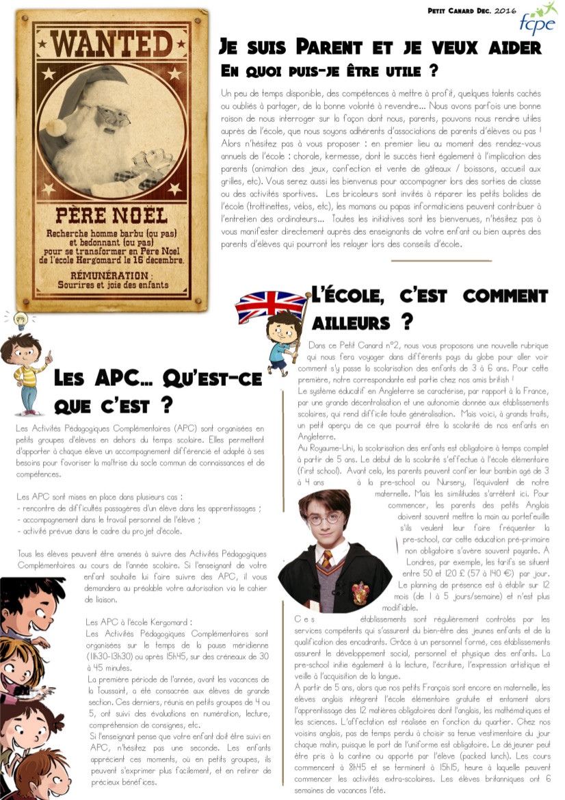 L’équipe FCPE de Kergomard a distribué aux parents, ce matin devant l’école, « Le petit Canard FCPE Kergo » n°2. Ce deuxième numéro gagne en densité avec 4 pages de conseils et d’informations. Télécharger Le petit Canard FCPE Kergo.