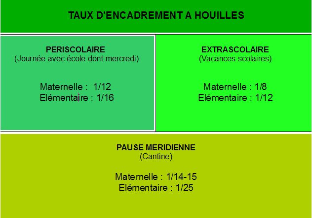 Les taux d’encadrement à respecter par les communes dépend de la mise en place d’un PEDT (Projet Éducatif Territorial). En effet, les taux d’encadrement pour les temps périscolaires et extrascolaires sont plus souples pour les communes qui ont mis en place un PEDT, ce qui est le cas de la ville de Houilles. Concernant la pause méridienne (cantine), il n’existe, à l’heure actuelle, aucune réglementation qui obligerait les communes à suivre un taux d’encadrement donné. Chaque ville est libre de choisir le nombre d’adultes encadrants pour le temps de la cantine.
