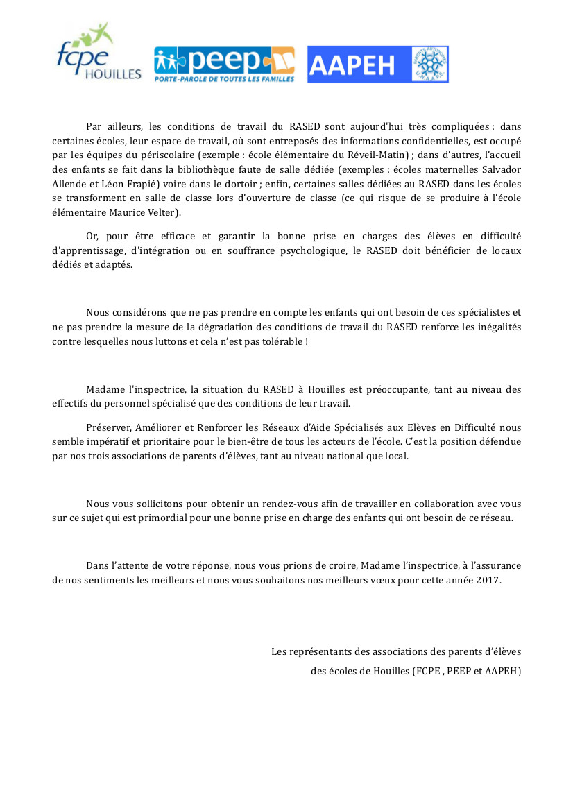 Les trois associations de parents d’élèves (FCPE, PEEP, AAPEH) de Houilles se sont associées pour faire part, à Madame l’Inspectrice d’Académie, de leurs inquiétudes face à la situation du RASED sur la ville, qui manque cruellement de moyens. Téléchargez le courrier ou découvrez le ci-dessous. Retrouvez plus d’informations sur le RASED dans cet article, toujours d’actualité !!