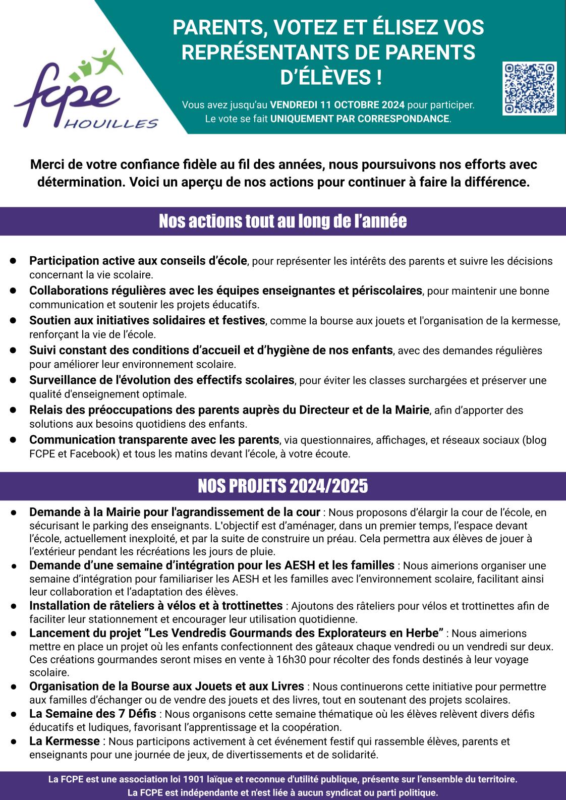Comme chaque année, l’équipe FCPE de notre école se présente aux élections des représentants des parents d’élèves. Nous sommes un groupe de parents engagés pour améliorer la vie scolaire de nos enfants et renforcer le lien entre les familles et l’école.