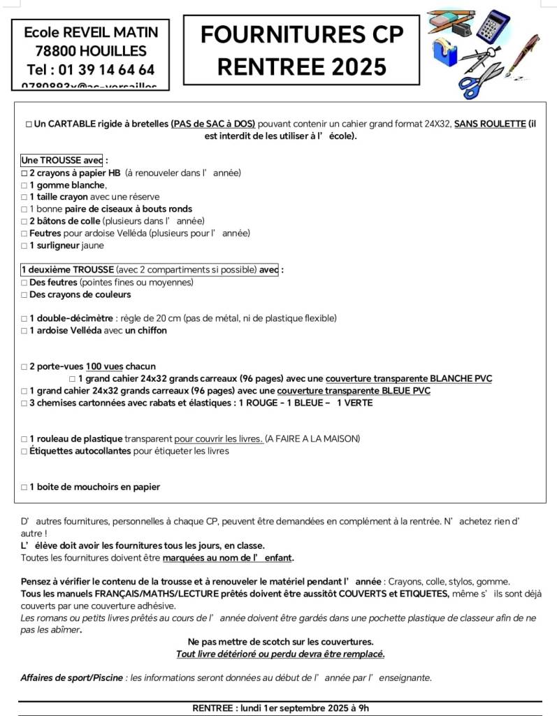 Vous trouverez en image un exemple de fournitures demandées au CP.