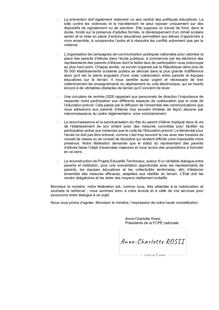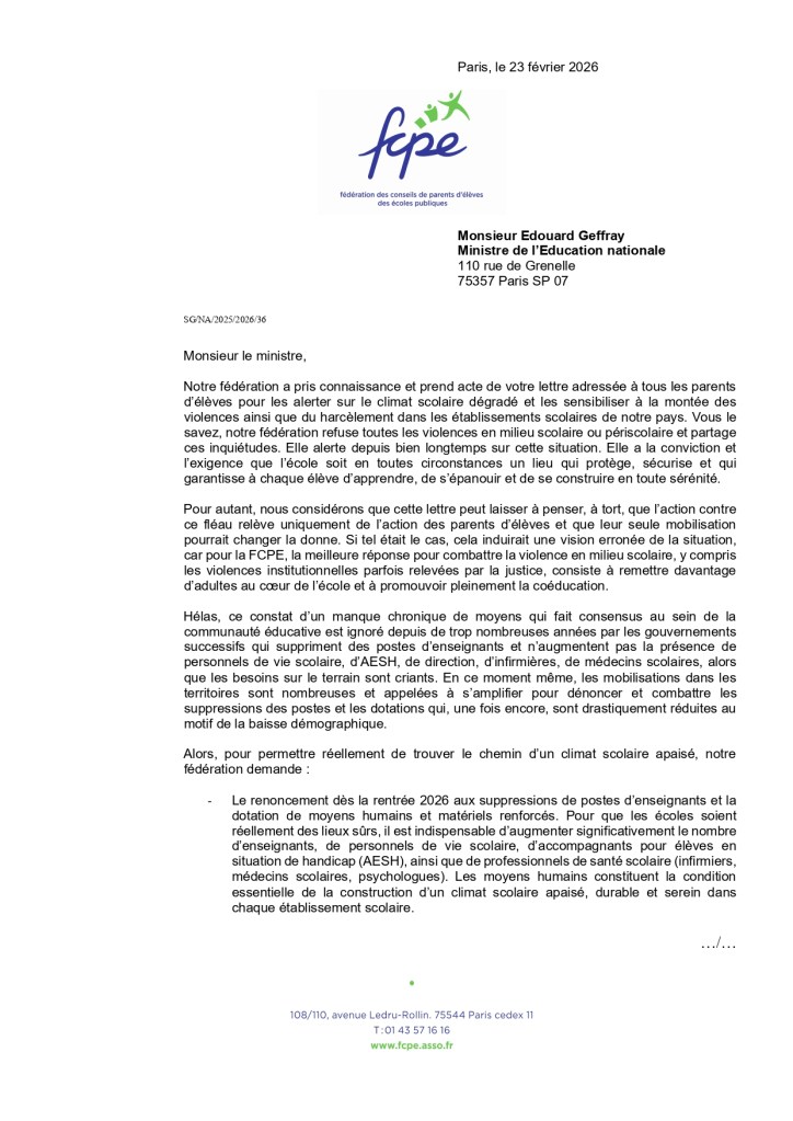 En réponse à ce courrier, la FCPE – Fédération des Conseils de Parents d’Elèves des écoles publiques fait part au ministre de ses inquiétudes face aux phénomènes de violence, tout en pointant de graves dysfonctionnements au sein de l’Éducation nationale. Des suppressions de postes sont programmées à chaque rentrée scolaire, alors même que l’on constate une dégradation de la santé mentale des jeunes.